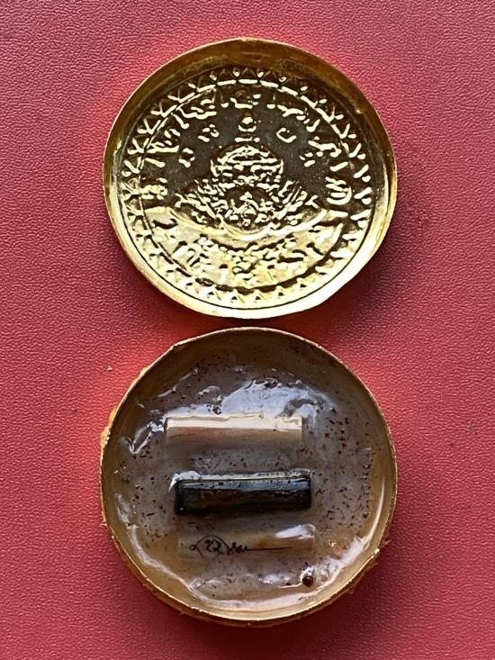เคาะเดียวแดง สีผึ้งพระราหู รุ่น มงคลจักรวาล เนื้อ โลหะชุบทองลงยาสีดำขอบสีแดง ขนาด5ซม |