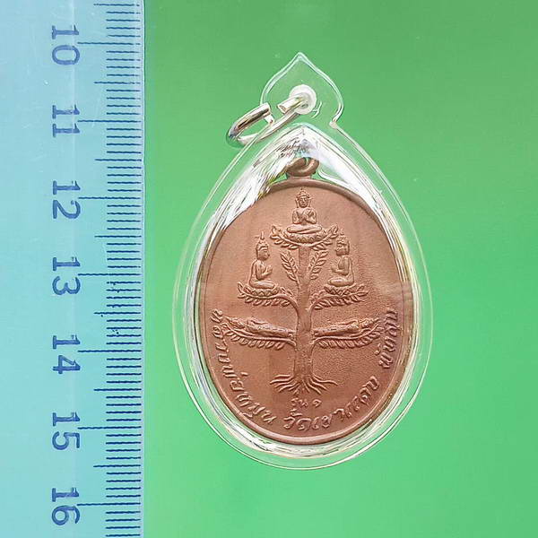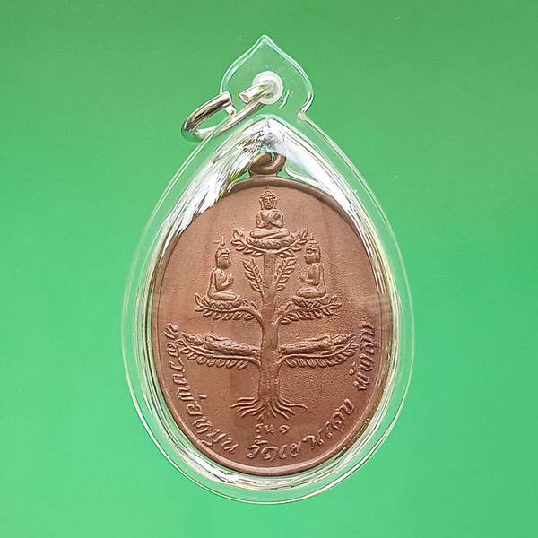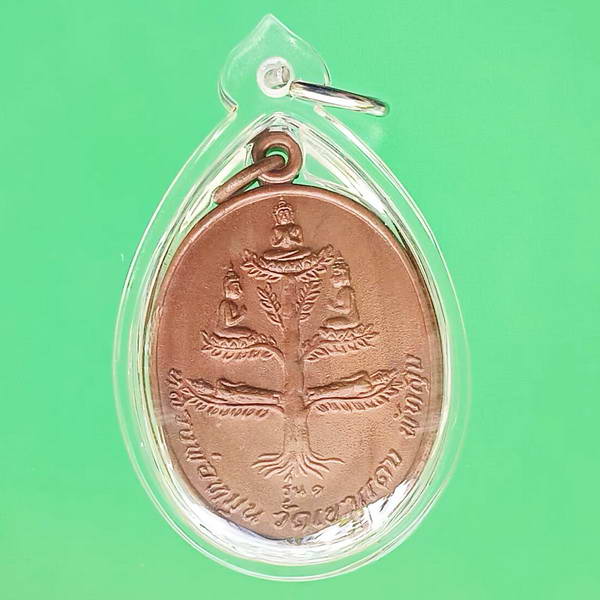 เหรียญต้นไม้ปางยมกปาฏิหาริย์ อ.หมุน วัดเขาแดงตะวันออก ปี 2516 มีผด ตัวหนังสือเอียง หลังยันต์เฉลวแปดทิศ นะ อุทธัง อะโธ ในเลี่ยม