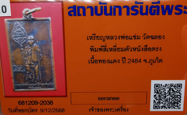 เหรียญหลวงพ่อแช่ม วัดฉลอง พิมพ์สี่เหลี่ยมตัวหนังสือตรง เนื้อทองแดง ห่วงเดิม ปี2484 จ.ภูเก็ต + บัตรG-pra สภาพเดิมค่ะ |
