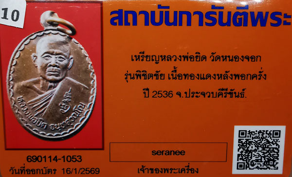 เหรียญหลวงพ่อยิด วัดหนองจาก รุ่นพิชิตชัย เนื้อทองแดง ห่วงเดิม หลังพอกครั่ง ปี2536 จ.ประจวบคีรีขันธ์ + กล่องเดิม + บัตรG-pra สภาพสวยเดิมค่ะ
