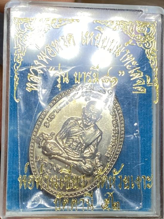 เหรียญไข่ปลาหลวงพ่อทวดหลังหลวงปู่เขียว รุ่น บารมี 81 ประสบการณ์ยิง 21 นัดไม่เข้า เนื้อ อัลปาก้าหูตัน กรรมการ 2 โค๊ด สวยมาก กล่องเดิม ปี 2552 |