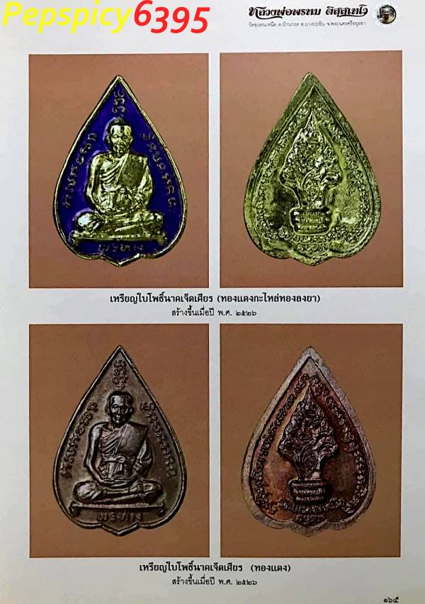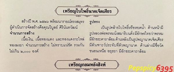 เหรียญใบโพธิ์นาคเจ็ดเศียร เนื้อทองแดง สร้างปี พ.ศ.2526 หลวงพ่อพรหม วัดขนอนเหนือ จ.อยุธยา จัดสร้างพร้อมเหรียญนารายณ์ทรงสมุทร จำนวนการสร้างรวมทุกเนื้อไม่เกิน 2,000 องค์
