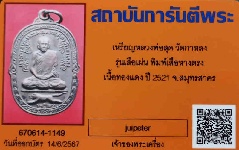 เหรียญหลวงพ่อสุด วัดกาหลง รุ่นเสือเผ่น พิมพ์เสือหางตรง เนื้อทองแดง ปี 2521 พร้อมบัตรการันตรีพระ