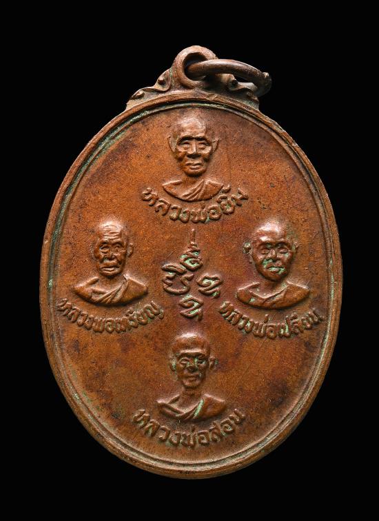 เหรียญปัญจะเกจิรุ่นแรก หลวงพ่อลำใย วัดทุ่งลาดหญ้า จ.กาญจนบุรี ปี 2519 ด้านหน้าเหรียญเป็นรูปหลวงพ่อยิ้ม , หลวงพ่อเหรียญ วัดหนองบัว , หลวงพ่อเปลี่ยน วัดใต้ และหลวงพ่อสอน วัดทุ่งลาดหญ้า ซึ่งเป็นครูบาอาจารย์ที่หลวงพ่อลำใยท่านให้ความเคารพนับถือ ส่วนด้านหลังเหรียญเป็นรูปหลวงพ่อลำใยนั่งเต็มองค์ เนื้อทองแดง |