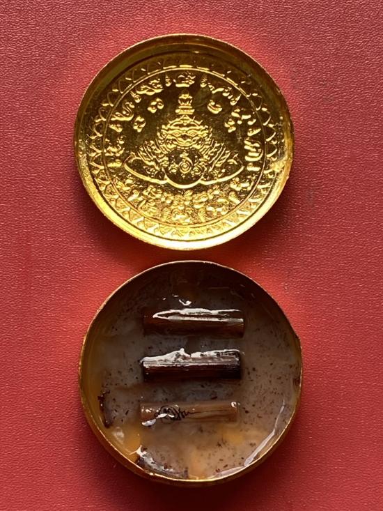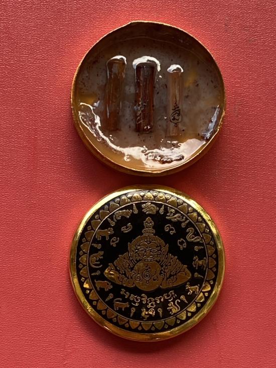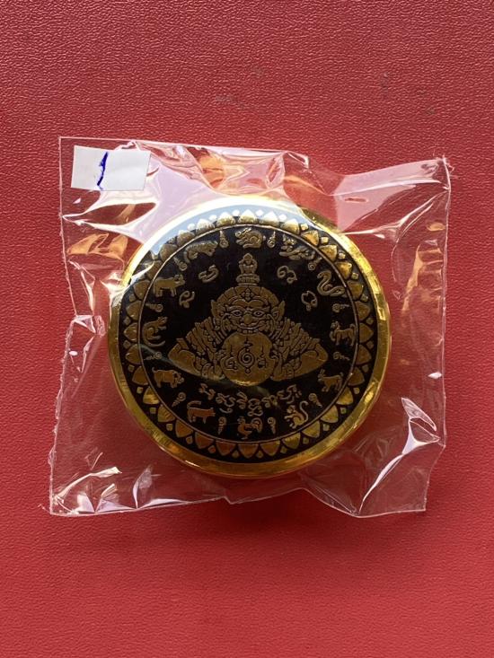 เคาะเดียวแดง สีผึ้งพระราหู รุ่น มงคลจักรวาล เนื้อ โลหะชุบทองลงยาสีดำขอบสีดำ ขนาด5ซม |