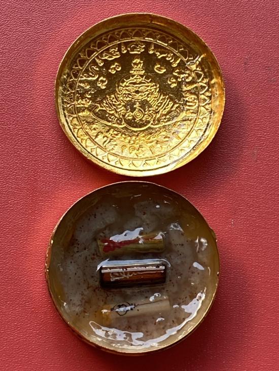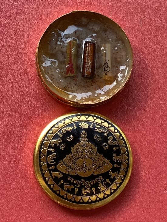 เคาะเดียวแดง สีผึ้งพระราหู รุ่น มงคลจักรวาล เนื้อ โลหะชุบทองลงยาสีดำขอบสีดำ ขนาด5ซม |