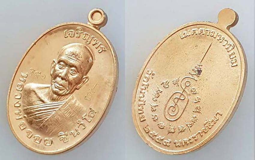 ::(วัดใจต่ำจอง((ราคาจอง 250 บาท))หลวงพ่อจอย ชินวังโส วัดโนนไทย(รุ่น-เจริญพรบนครึงองค์รุ่นแรก):: ::(**A13-เหรียญรูปไข่**เนื้อ-ทองทิพย์ หมายเลข 1506 ราคาจอง 250 บาท::พร้อมกล่อง ****((สภาพเงาสวย))****