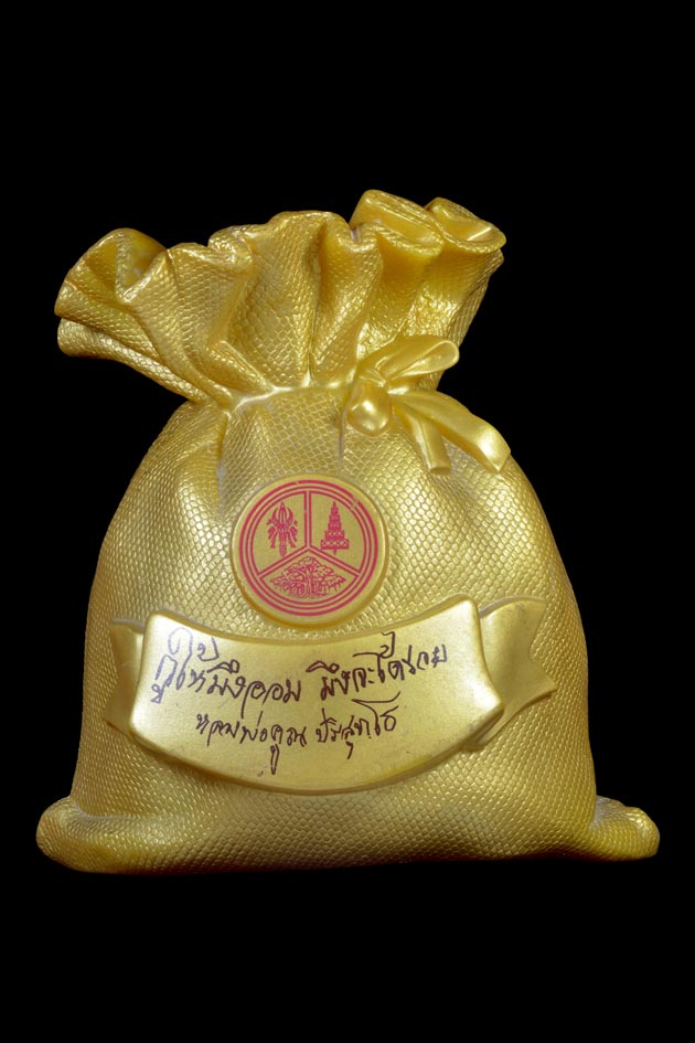 ++วัตถุประสงค์ : ได้รับความเมตตาจาก หลวงพ่อคูณ มอบคาถา มหารวย " กูให้มึงออม มึงจะได้ไม่จน " นำมาจัดทำตราประทับลงบนผลิตภัณฑ์ หรือบริการทางการเงินทุกประเภทที่ลูกค้าเข้ามาใช้บริการ ภายในของธนาคาร เพื่อมอบกำลังแก่ลูกค้า ซึ่งพร คาถามหารวยนี้ หลวงพ่อคูณ มอบเพื่อเตือนสติให้ทุกคนตระหนักถึงความสำคัญของการออมอยู่เสมอ โดยตราประทับ แกะจากลายมือจริงของ หลวงพ่อคูณ รวมทั้งได้ผ่านการทำพิธีปลุกเสกจาก หลวงพ่อคูณ ในวันคล้ายวันสถาปนาธนาคารออมสิน ครบ 94 ปี วันที่ 1 เมษายน พ.ศ.2550 ธนาคารออมสิน จัดทำกระปุกออมสิน รุ่น พิเศษกระปุกออมสินถุงทอง โดยหลวงพ่อคูณได้เมตตาให้นำคาถามหารวยกูให้มึงออมมึงจะได้รวย ซึ่งเป็นลายมือจริงของหลวงพ่อคูณมาพิมพ์ลงในกระปุกออมสิน จำนวน 600,000 ใบ |