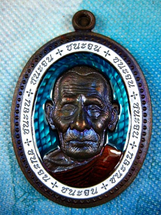 ### เนื้อนวะ ### เหรียญรุ่นชนะจน เนื้อนวะโลหะลงยาพื้นฟ้า ขอบขาว ลงยาจีวร หลวงปู่สมาน (---A25---) |