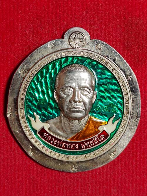 รุ่นแรกเหรียญขวัญถุง มหาโชคมังกรคู่ หลวงพ่อทอง สุทธสีโล ออกวัดบ้านไร่ ปี 62 เนื้อ เงินลงยาสีเขียวพิมพ์กรรมการไม่ตัดปีกหลังยันต์ หมายเลข 146 ตอกโค๊ตเลข 9 เก้าตัว เคาะเดียวแดง |