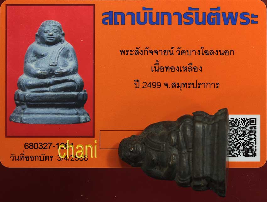 พระสังกัจจายน์ วัดบางโฉลง เนื้อทองเหลือง ปี2499 จ.สมุทรปราการ สภาพสวยเก่าตามอายุหายาก อุดกริ่ง เสียงดังไม่ขัด พร้อมบัตรรับรองพระแท้จากจีพระอุ่นใจได้ ไม่ต้องลุ้นค่ะ