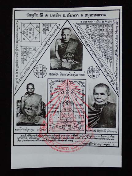 รูปขาวดำ 3อาจารย์ (ลพ.คง วัดบางกะพ้อม/ลพ.แช่ม โสฬส/ลพ.เนื่อง) ปั๊มยันต์หมึกแดง หลวงพ่อเนื่อง วัดจุฬามณี จ.สมุทรสงคราม ปี 2511