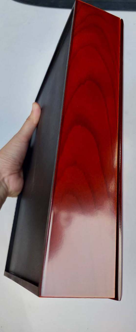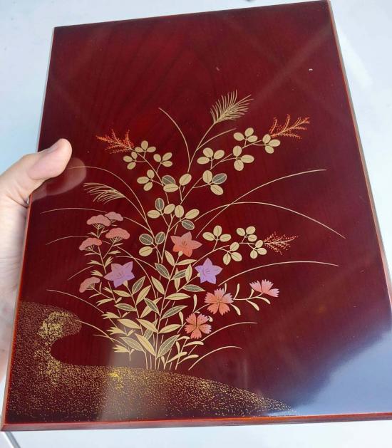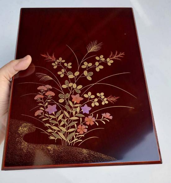 ***วัดใจ***กล่องไม้เแลคเกอร์ญี่ปุ่นสีแดงเข้มวินเทจตกแต่งลายทอง หญ้าและดอกไม้ในฤดูใบไม้ร่วง ขนาด 12 X 9 นิ้ว สูง 2.5 นิ้ว |