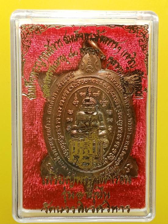 พญาเต่าเรือน รุ่นอายุยืน ฉลองพระชนมายุ ๘๐ พรรษา ๓ ตุลาคม ๒๕๓๖ เนื้อทองแดงผสมชนวนพระสังกัจจายน์ญส.ปี ๒๕๓๐ (พระสังกัจจายน์ญส.รุ่นแรก ปี ๒๕๓๐ เป็นรุ่นสำคัญมีส่วนผสมของชนวนพระกริ่งบวรรังสี ๒๕๒๘ และชนวนพระกริ่งปวเรศ ๒๕๓๐ ล้วน ๆ โดยไม่มีชนวนพระรุ่นอื่นเจือปนเลย) พิธีพุทธาภิเษก-ชัยมังคลาภิเษก ณ พระอุโบสถวัดบวรนิเวศวิหาร หลวงปู่หลิว ปณฺณโก วัดไร่แตงทอง เทพเจ้าแห่งพญาเต่าเรือน ร่วมปลุกเสกในพิธี หลวงพ่อเปิ่น หลวงพ่อแย้ม วัดสามง่าม หลวงพ่อพูล วัดไผ่ล้อม หลวงพ่อไสว วัดปรีดาราม หลวงพ่อแช่ม วัดดอนยายหอม หลวงพ่อยิด วัดหนองจอก หลวงพ่อสง่า วัดบ้านหม้อ ฯลฯ ร่วมพิธี เคาะเดียว พระมาพร้อมกล่องเดิม