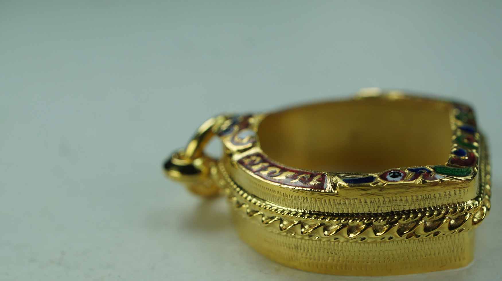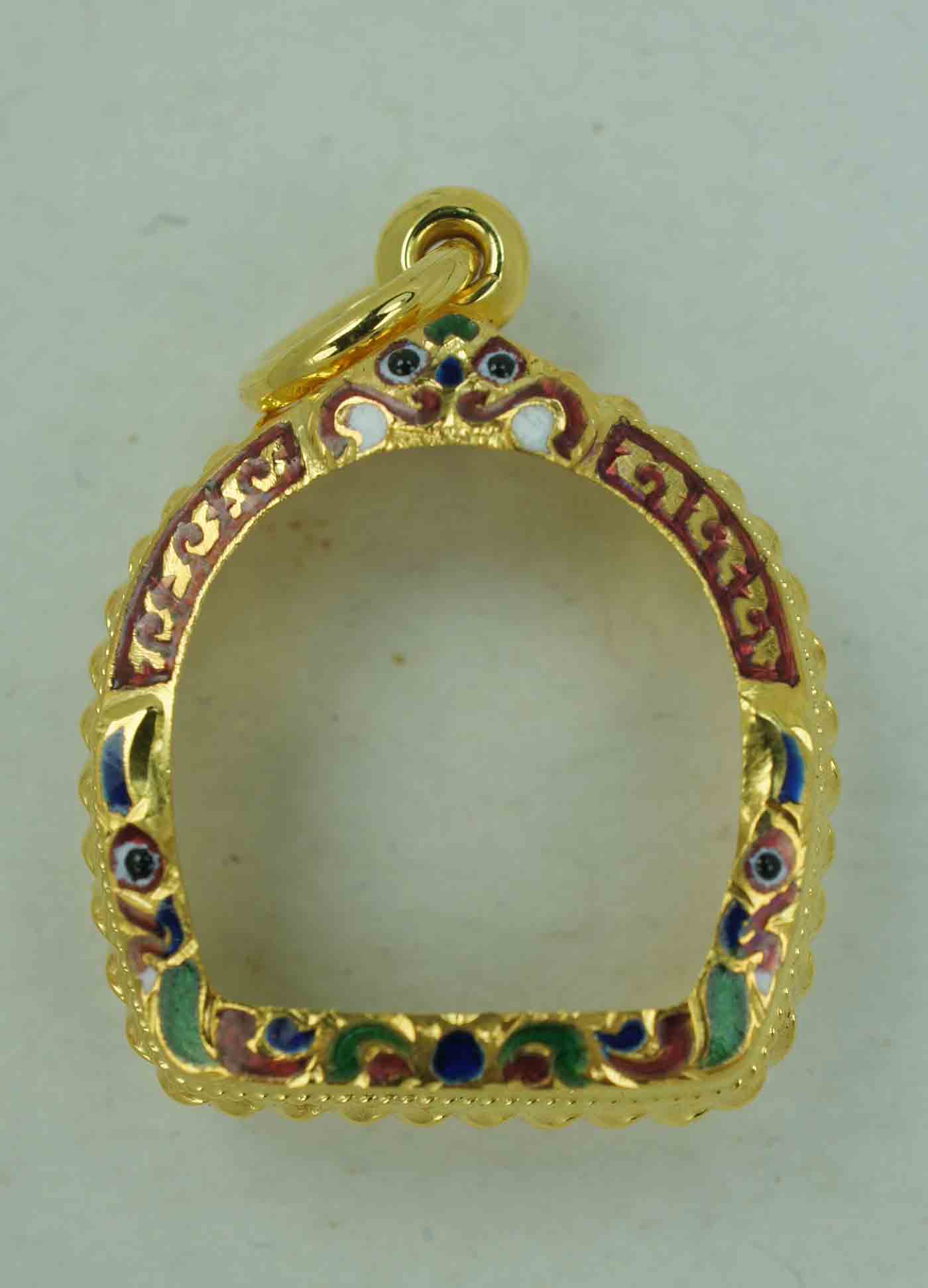 กรอบทอง ลงยาล้อม ยกซุ้ม หัวสิงห์ ข้างเกลียวโปเต้ 3 เส้น แกะลายทั้งใบ ใส่พระปิดตาปุ้มปุ้ย *** หลวงปู่ทิม วัดละหารไร่ ***หรือขนาดไกล้เคียง ขนาดกว้างจากขอบใน *** สูง 1.4 กว้างจากฐาน 1 ซม. *** งานขึ้นมือ |