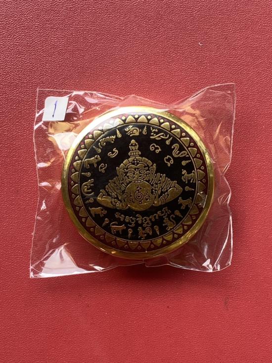 เคาะเดียวแดง สีผึ้งพระราหู รุ่น มงคลจักรวาล เนื้อ โลหะชุบทองลงยาสีดำขอบสีแดง ขนาด5ซม |