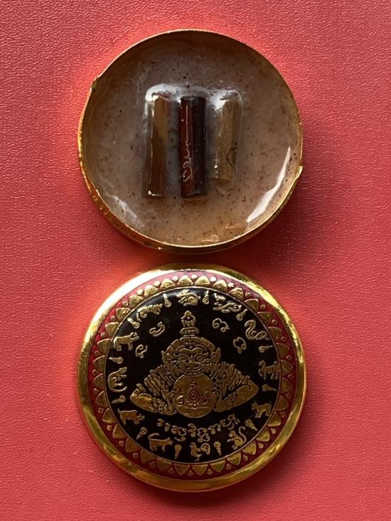 เคาะเดียวแดง สีผึ้งพระราหู รุ่น มงคลจักรวาล เนื้อ โลหะชุบทองลงยาสีดำขอบสีแดง ขนาด5ซม |