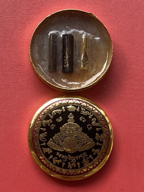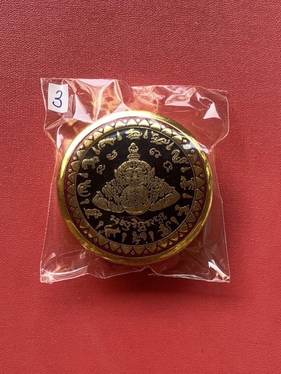 เคาะเดียวแดง สีผึ้งพระราหู รุ่น มงคลจักรวาล เนื้อ โลหะชุบทองลงยาสีดำขอบสีแดง ขนาด5ซม |