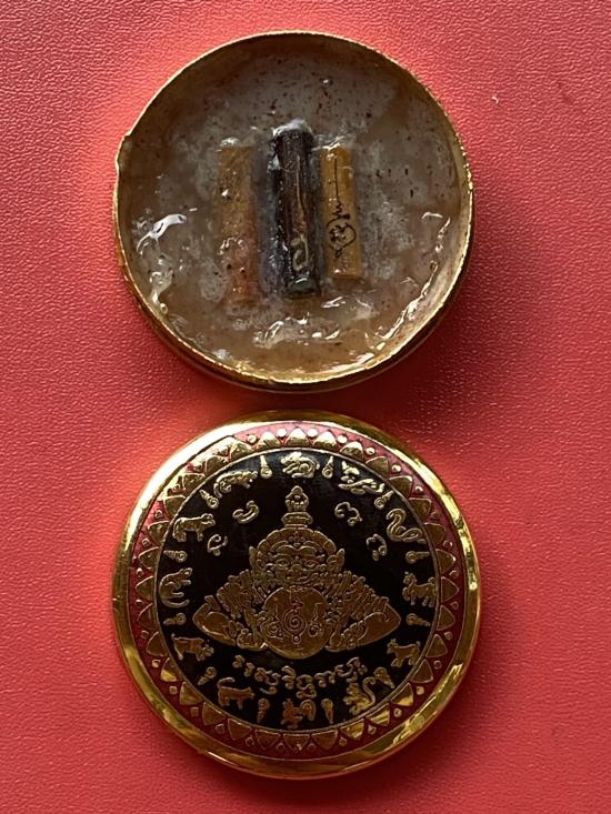 เคาะเดียวแดง สีผึ้งพระราหู รุ่น มงคลจักรวาล เนื้อ โลหะชุบทองลงยาสีดำขอบสีแดง ขนาด5ซม |