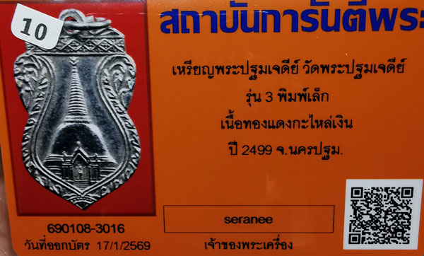 เหรียญพระปฐมเจดีย์ วัดพระปฐมเจดีย์ รุ่น3 พิมพ์เล็ก เนื้อทองแดงกะไหล่เงิน ห่วงเดิม ปี2499 จ.นครปฐม + บัตรG-pra สภาพสวยเดิมค่ะ