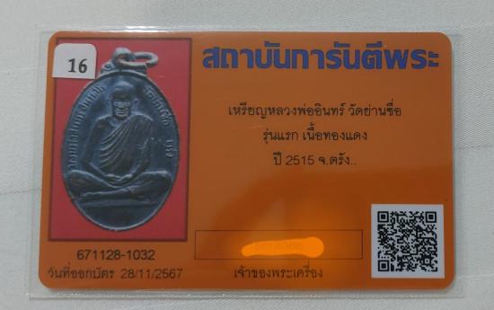 เหรียญหลวงพ่ออินทร์ รุ่นแรก (บล็อกนิยมไม่ยืด) ปี ๑๕ วัดย่านซื่อ จ.ตรัง #พร้อมบัตร #พระสภาพผิวหิ่งเดิมๆ