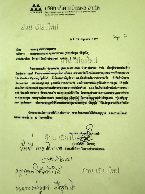 ++ผู้จัดสร้าง : คุณ นายบรรเทิง ( ผู้อำนวยการ ) และ นายวิเชียร ( เจ้าหน้าที่บริหาร ) บริษัท น้ำตาลมิตรผล จำกัด อ.ด่านช้าง จ.สุพรรณบุรี อนุญาตให้สร้าง วันที่ 30 มิถุนายน พ.ศ.2537