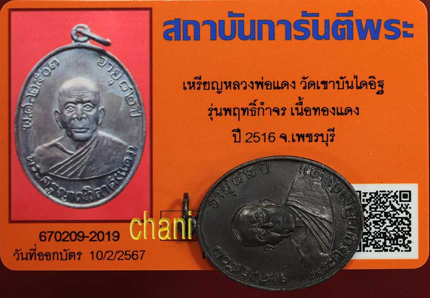 เหรียญ หลวงพ่อแดง วัดเขาบันไดอิฐ รุ่นพฤทธิ์กำจร เนื้อทองแดง ปี2516 จ.เพชรบุรี สภาพสวยๆ มีผิวปรอทงามๆเดิมๆ หายากมากสภาพนี้ พร้อมบัตรรับรองจากจีพระอุ่นใจได้