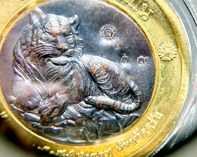 เหรียญโชคดี พญาเสือนอนกิน รุ่นแรก พระอาจารย์ประสูติ วัดในเตา จ.ตรัง เนื้อทองทิพย์ลงยาแดง หน้ากากเสือโลหะอาถรรพ์ เลข 19