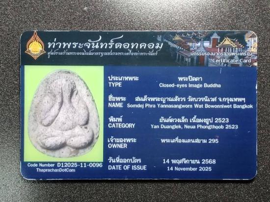 พระปิดตายันต์ดวงเล็ก หรือยันต์ดวงสุกิตติมา เนื้อผงธูปกัมมัฏฐาน สอดตะกรุดเงิน สมเด็จพระญาณสังวร(เจริญ สุวัฑฒโน ปธ.๙) พิธีพุทธาภิเษก ณ พระอุโบสถคณะรังสี วัดบวรนิเวศวิหาร ๒ ตุลาคม ๒๕๒๓ หลวงปู่โต๊ะ วัดประดู่ฉิมพลี ร่วมปลุกเสก สมเด็จพระญาณสังวรฯทรงจุดเทียนชัยและประธานอธิษฐานจิต พร้อมด้วยพระคณาจารย์แห่งยุคอีกหลายรูป ไม่มีกล่อง เคาะเดียว เนื้อผงธูปกัมมัฏฐานสร้างน้อย มีบัตรรับรองจากชมรมพระเครื่องท่าพระจันทร์