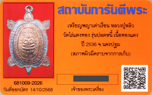 เหรียญเต่าปลดหนี้(รุ่นแรก) หลวงปู่หลิว วัดไร่แตงทอง เนื้อทองแดง ปี2536
