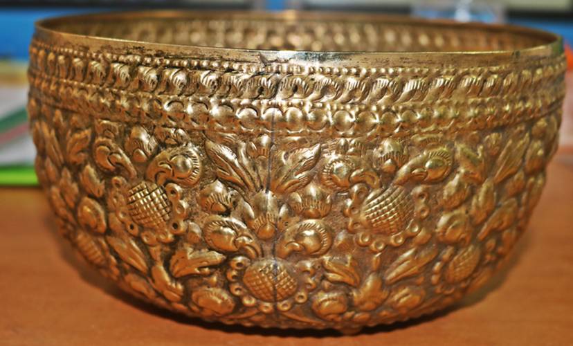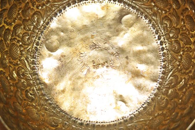 ขันทองเหลืองแกะลายงานเก่าๆ ปากกว้าง 8.7 นิ้ว สูง 4.8 นิ้ว |
