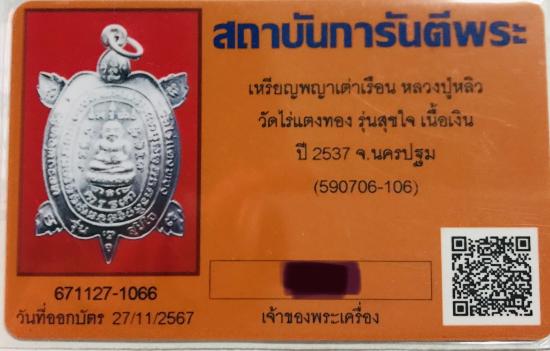 เหรียญพญาเต่าเรือนหลวงปู่หลิวรุ่นสุขใจ ปี ๓๗ เนื้อเงิน พร้อมใบประกาศ