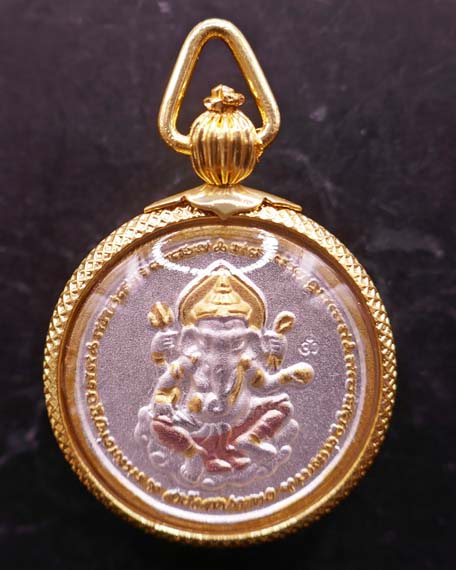 !!!!วัดใจ 9 บาท!!!! เหรียญพระพิฆเณศวร-บรมครูปู่ฤาษี(พ่อแก่) วัดไผ่ล้อม จ.นครปฐม เนื้อ 3กษัตริย์ พร้อมเลี่ยม ขนาด2.2cm กล่องเดิม |