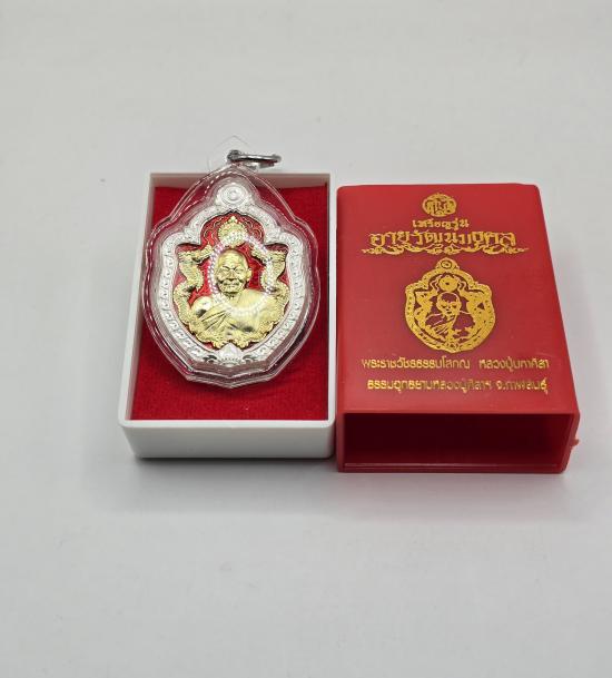 เหรียญ มังกรคู่ อายุวัฒนมงคล 81ปี หลวงปู่มหาศิลา หลวงปู่ศิลา สิริจันโท ธรรมอุทยาน วัดพระธาตุหมื่นหิน จ.กาฬสินธุ์ เนื้อฝาบาตรลงยาแดง ขอบเงิน เลข ๓๖๒ เลี่ยมกันน้ำ มีกล่องเดิม