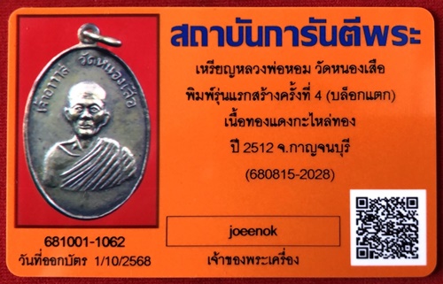 เหรียญหลวงพ่อหอม วัดหนองเสือ พิมพ์รุ่นแรกสร้างครั้งที่ 4 ( มีจาร หน้า-หลัง ) เนื้อทองแดงกะไหล่ทอง ปี 2512 จ.กาญจนบุรี สวยเดิม มาพร้อมบัตรรับรองครับ |