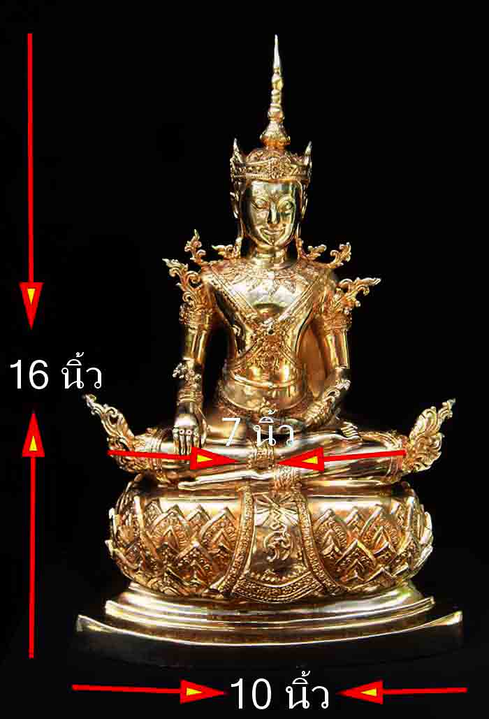 พระพุทธรูปปางโปรดพญาชมพูบดีหรือปางทรงเครื่อง ทรงเครื่องต้น สวยสง่า งดงามอลังการ อยู่ในพระอิริยาบถประทับ (นั่ง) ขัดสมาธิ พระหัตถ์ซ้ายวางหงายบนพระเพลา (ตัก) พระหัตถ์ขวาวางคว่ำบนพระชานุ (เข่า) ทรงเครื่องต้นอย่างกษัตริย์ เนื้อทองเหลืองขัดมันปัดทอง หน้าตัก 7 นิ้ว ขนาดความสูง 16 นิ้ว |