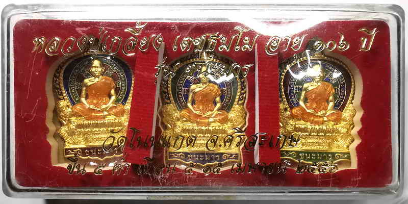 ( เคาะเดียว 1กล่อง 3องค์ ) เหรียญเสมานั่งพาน รุ่นชนะมาร หลังหนุมานเชิญธงชนะศึก เนื้อทองแดงกะหลั่ยทองลงยา ชุด 3 สี หลวงปู่เกลี้ยง วัดโนนแกด จ.ศรีสะเกษ พ.ศ.2556 สร้างเพียง 999ชุดเท่านั้น ตอกโค๊ตและหมายเ
