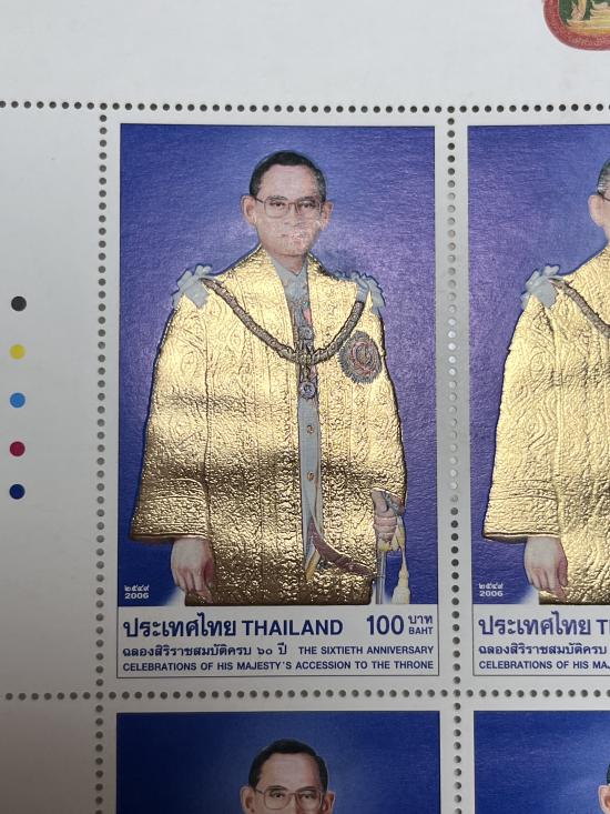 แสตมป์ที่ระลึกงานฉลองสิริราชสมบัติครบ 60 ปี พระบาทสมเด็จพระเจ้าอยู่หัวภูมิพลอดุลยเดช เป็นแสตมป์ใหม่ที่ยังไม่ผ่านการใช้ ราคาหน้าแสตมป์ดวงละ 100 บาท จำวน 6 ดวง