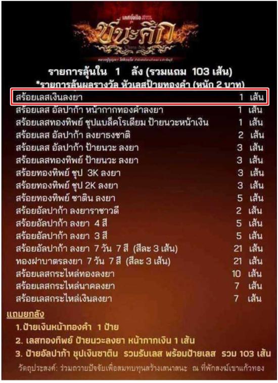 @@ เลสชนะศึก (ความยาวรวมสาย 8 นิ้ว) หลวงปู่บุญมา โชติธัมโม สำนักสงฆ์เขาแก้วทอง จ.ปราจีนบุรี เนื้อเงิน ลงยา หมายเลข 46 (น้ำหนักรวม 55 กรัม)