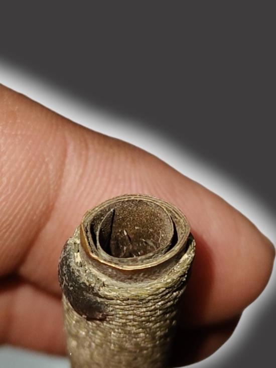 A6729.เครื่องรางตะกรุดเก่า พันเชือก ยาว 2 นิ้ว ไม่ทราบที่ เคาะเดียวเเดง |