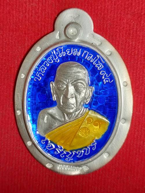 เหรียญหลวงปู่นิยม กมโล รุ่น เจริญพรเมตตา มหานิยม ออกวัดแจ้งนอก ปี 2555 เนื้อ เงินลงยาสีน้ำเงินพิมพ์กรรมการไม่ตัดปีกหลังยันต์ หมายเลข 19 ตอกโค๊ตเลข 9 เก้าตัว สภาพสวย เคาะเดียวแดง