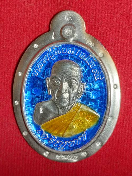 เหรียญหลวงปู่นิยม กมโล รุ่น เจริญพรเมตตา มหานิยม ออกวัดแจ้งนอก ปี 2555 เนื้อ เงินลงยาสีฟ้าพิมพ์กรรมการไม่ตัดปีกหลังยันต์ หมายเลข 18 ตอกโค๊ตเลข 9 เก้าตัว สภาพสวย เคาะเดียวแดง