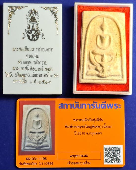 ++ข้อมูลเพิ่มเติม...........พระสมเด็จมหาราช ทรงครุฑ วัดทุ่งสีกัน(พุทธสยาม) เขต ดอนเมือง กรุงเทพ 2518 จัดสร้างในวโรกาศ ที่พระบาทสมเด็จพระเจ้าอยู่หัวภูมิพลอดุลยเดชมหาราชทรงมีพระชนมายุครบ 4 รอบ ทรงมีพระเมตตาโปรดเกล้า ให้วัดทุ่งสีกัน(วัดพุทธสยาม) สร้างพระประธานองค์พระพุทธสมเด็จมหาราชทรงครุฑ ภปร. ขนาดหน้าตัก 69 นิ้ว สูง 119 นิ้ว เพื่อประดิษฐานที่วิหารจัตุรมุข ไว้เป็นที่สักการะบูชากราบไหว้ แก่พุทธศาสนิกชนชาวพุทธ และทรงพระราชทานทองคำแท่งเพื่อให้นำมาตะไบผสมลงในพระผงพุทธคุณ ที่จัดสร้างครั้งนี้ ซึ่งร้านทอง " ลิ่มกุยหลี" บางลำพู เป็นร้านที่นำทองคำพระราชทานไปตะไบเป็นผง ทางวัดได้มอบให้ นายสมชาย แสวงศิลป์ เป็นผู้ดำเนินการ จึงเป็นพระสมเด็จที่เพียบพร้อมไปด้วยมวลสารอันศักดิ์สิทธิ์ และพิธีกรรมที่ดีเยี่ยม จัดเป็นพระรุ่นแรกของวัดสีกัน และพระครูธรรมรัตนวิมล(หลวงปู่ทองใบ) เจ้าอาวาส วัดสีกัน ได้เกิดมงคลนิมิตรว่า เจ้าพระคุณสมเด็จพระพุทฒาจารย์( โต พรหมรังสี )ให้สร้างพระผงพุทธคุณสมเด็จทรงครุฑขึ้นด้วยผงมงคล 38 ประการ พระสมเด็จมหาราชทรงครุฑนี้มีทั้งพิมพ์ใหญ่ และพิมพ์เล็กจำนวนการสร้างประมาณ 1,009 องค์ เท่านั้น ทุกองค์มีผงตะไบทองคำพระราชทาน หลวงปู่ทองใบท่านมิได้ให้บูชา แต่ท่านจะแจกประชาชนที่ร่วมทำบุญในการจัดสร้างพระพุทธมหาราชทรงครุฑครั้งนี้ โดย พระสมเด็จพิมพ์ใหญ่ ท่านจะมอบให้เฉพาะนายทหารอากาศชั้นผู้ใหญ่ ที่มาช่วยงาน ยุคนั้น(ปี2518) เป็นยุคคอมมิวนิสต์ พระบาทสมเด็จพระเจ้าอยู่หัวได้ทรงพระราชทาน พระสมเด็จมหาราชทรงครุฑ พิมพ์ใหญ่ให้กับนายทหาร ระดับนายพลที่เข้ารักษาการมหาดเล็กรักษาพระองค์ ผู้ใดได้ครอบครองพระสมมหาราชนี้ ถือว่ามีของดีมงคลวิเศษ ไว้คุ้มครองตนเองและครอบครัว