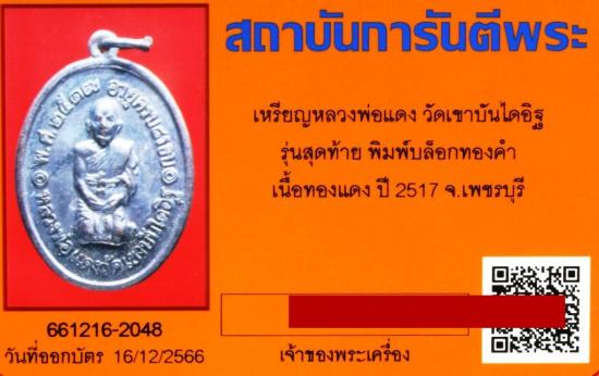 บล็อคหน้าทองคำ เหรียญคุกเข่า หลวงพ่อแดง วัดเขาบันไดอิฐ รุ่นสุดท้าย ปี 2517 เนื้อทองแดง มีบัตรรับรอง