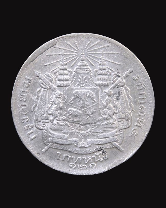 เหรียญบาทหนึ่่ง รัชกาลที่ 5 พระจุลจอมเกล้าเจ้าอยู่หัว (ร.5) หลังตราแผ่นดิน รศ.๑๒๑