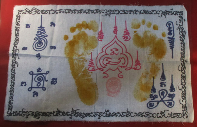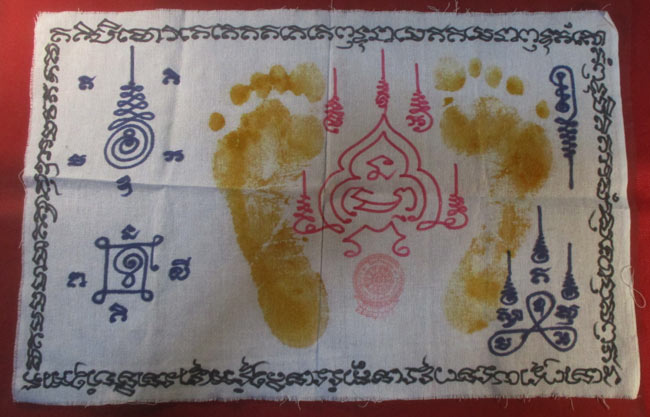 ผ้ายันต์ รอยท้าว จารยันต์ด้วยมือ ไม่ทราบที่ มีตราวัดแต่ผมอ่านไม่ออก ครับ (พระบ้านจากหิ้ง ครับ) |