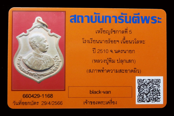 เหรียญ ร.๕ รุ่นแรก ร.ร.นายร้อยจปร. ครบรอบ ๘๐ ปี ลป.ทิมปลุกเสก ปี ๒๕๑๐ เนื้อนวโลหะ พร้อมบัตรรับรอง G-pra ครับ