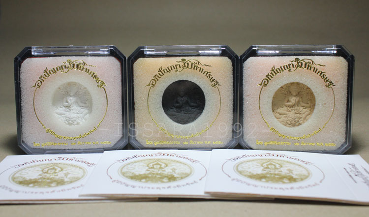 อภิปัญญามหาเศรษฐี พิมพ์เล็ก ขนาด 3.5 ซม. เนื้อผงพุทธคุณ 1 ชุด สามสี พร้อมกล่องเดิม มีปลอกขาวครบ พระสวยเก็บรักษาไว้อย่างดี (ขออนุญาตใช้ภาพเดิม) |