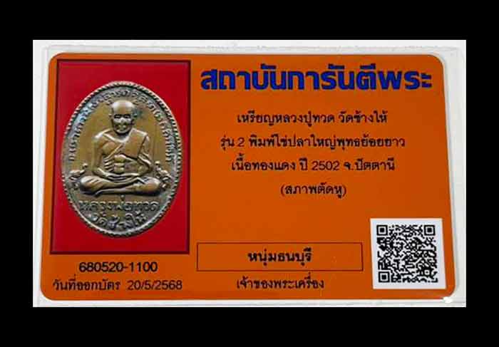 เหรียญหลวงปู่ทวด วัดช้างให้ รุ่น 2 พิมพ์ไข่ปลาใหญ่พุทธย้อยยาว (นิยม) เนื้อทองแดง ปี 2502 จ.ปัตตานี พระตัดหูยังสวยคม ถ้าไม่ตัดหู 2-3 หมื่น มาพร้อมบัตรจีพระ เคาะเดียวแดง 3,500 บาท
