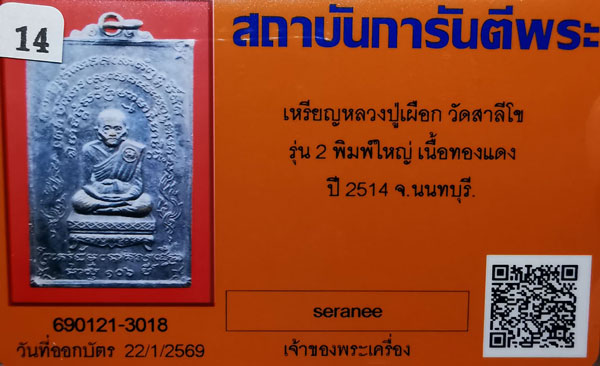 เหรียญหลวงปู่เผือก วัดสาลีโข รุ่น2 พิมพ์ใหญ่ เนื้อทองแดง ห่วงเดิม ปี2514 จ.นนทบุรี + บัตรG-pra สภาพเดิมค่ะ สภาพตามรูปทุกประการค่ะ